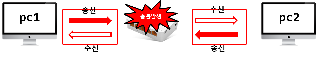 - 아래와 같이 pc1과 pc2 가 동시에 송신을 하게 되면 충돌이 발생하게 된다.