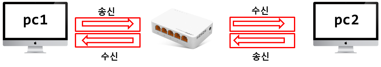 - 아래와 같이 pc1과 pc2가 동시에 송신을 한다고 하더라도 충돌의 문제가 없다.