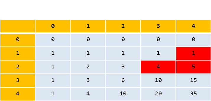 즉, dp[K][N] = dp[K][N-1] + dp[K-1][N] 로 일반화 시킬 수 있다.