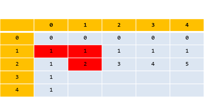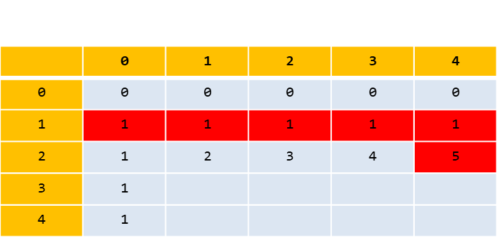 dp[2][4] = dp[1][0] + dp[1][1] + dp[1][2] + dp[1][3] + dp[1][4]
