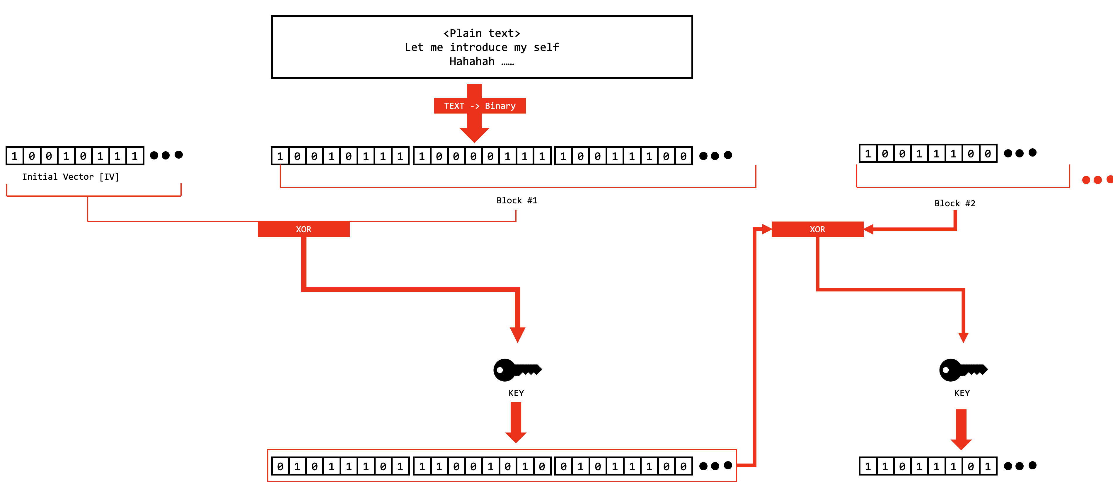 기존의 ECB 의 방식과 다르게 평문의 각 블록은 XOR 연산을 사용하여 이전 암호문과 연산이 된다.