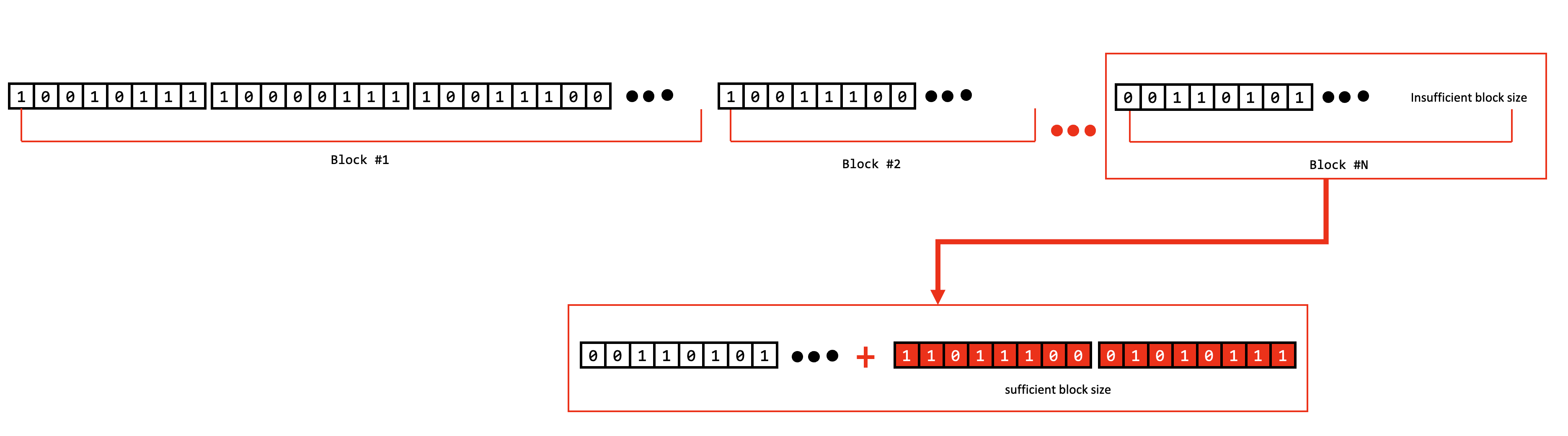 메시지의 길이가 n비트보다 작다면 n비트 블록을 만들기 위해 패딩(padding)이 추가된다.