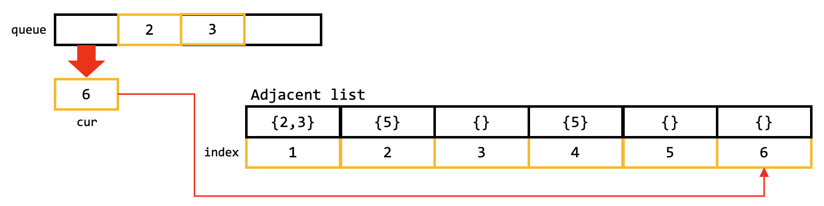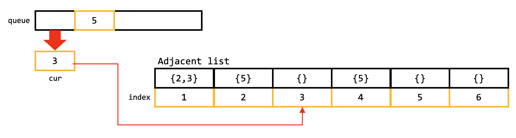 이때, Degree list의 값이 0 이 된다면, 해당 인덱스를 Queue에 넣으면 된다.