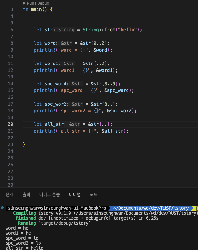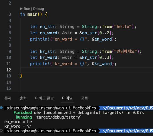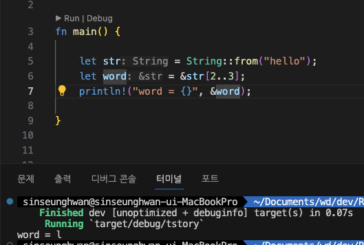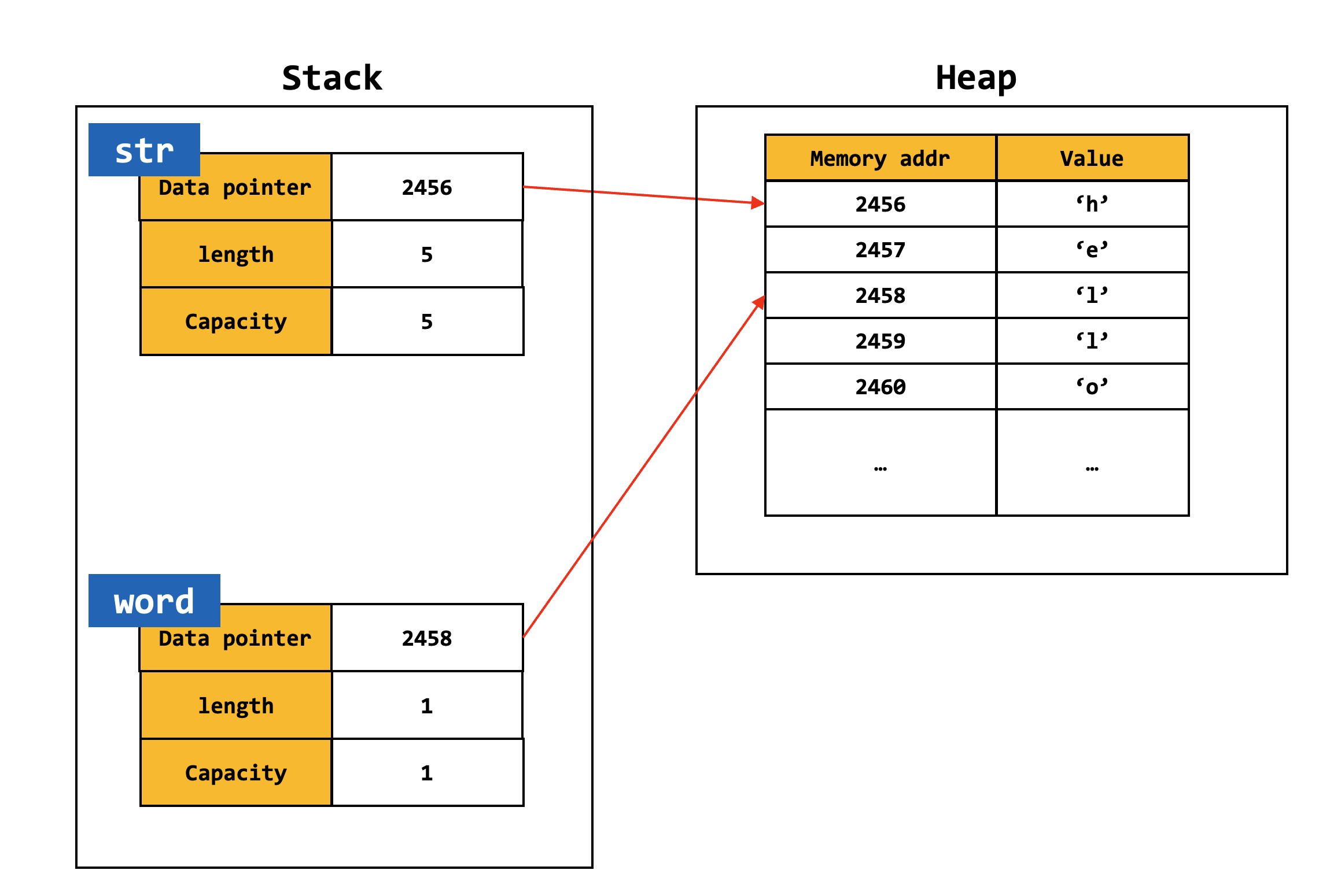 String 데이터의 slice 변수인 "word" 는 기존 str 데이터가 가리키는 메모리 영역을 가리키되,