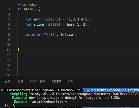 문자열의 일부를 참조하는 데 사용된다. 예를 들어, let slice = &s[0..2];는 문자열 s의 처음 두 글자를 가리키는 슬라이스이다.