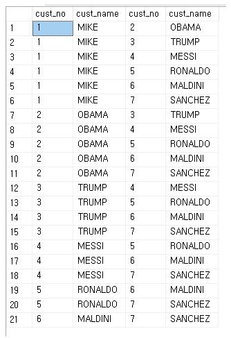 NON-EQUI JOIN 을 사용한 쿼리에서는 21개의 고유한 쌍만 나타나게 된다.