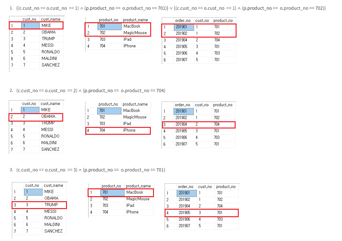 관계형 대수를 바탕으로 내부조인의 원리를 설명하면(논리적 방식),
