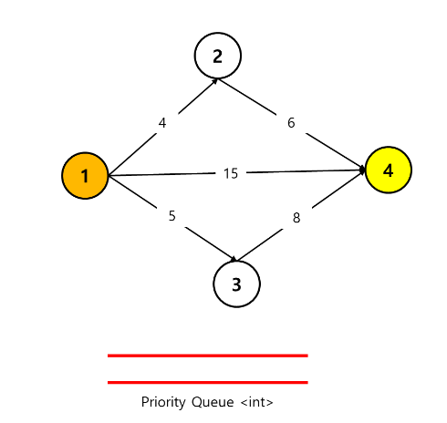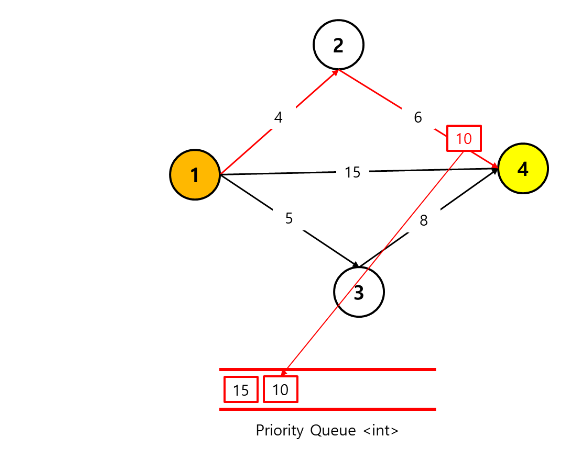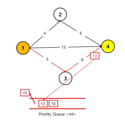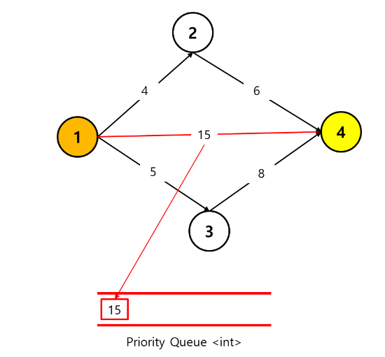 그럼 priority queue 에 아래와 같이 distance 값 15를 넣어줄 수 있다.